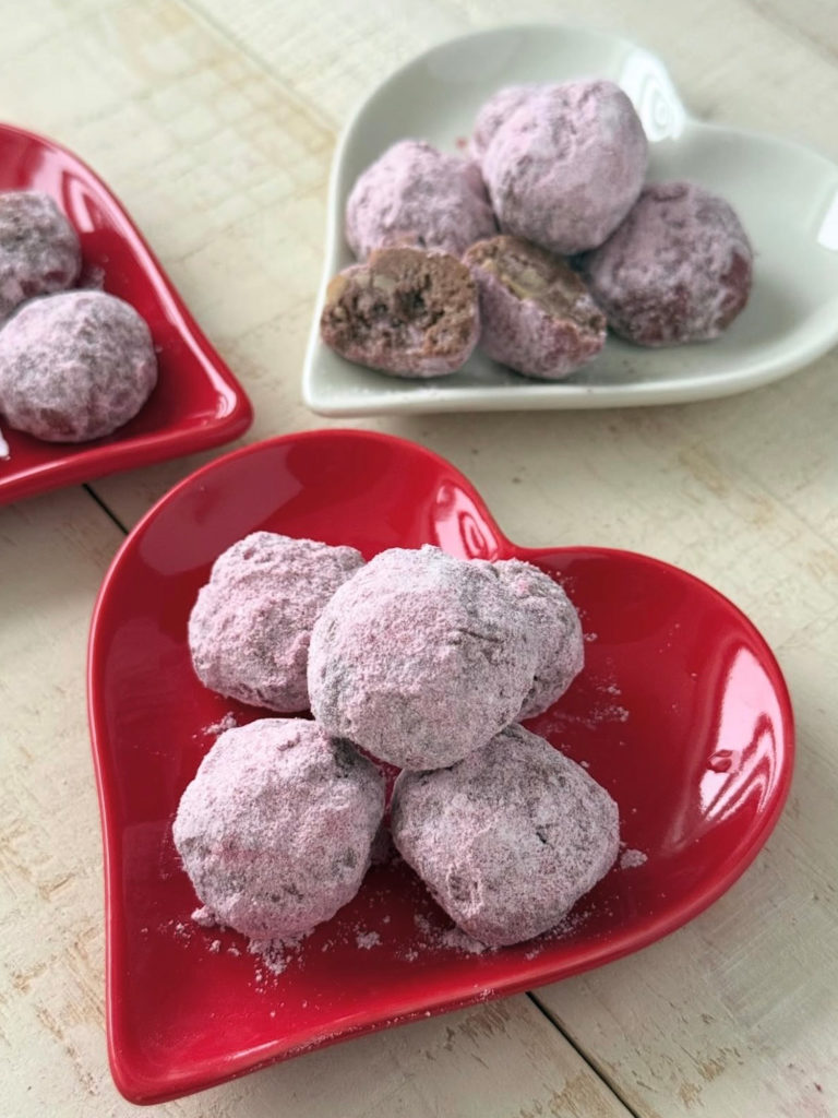 ・フランボワーズパウダーをまとった甘酸っぱいスノーボールクッキーです。